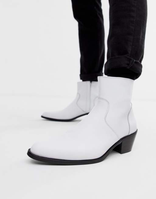 Asos Design Cuban Heel Western Chelsea Boots In White Leather Asos